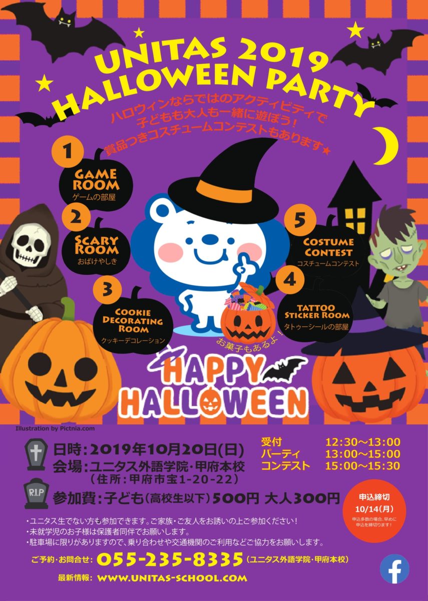 ユニタス外語学院では、2019年10月20日(日)に”2019 UNITAS HALLOWEEN PARTY”を開催します。