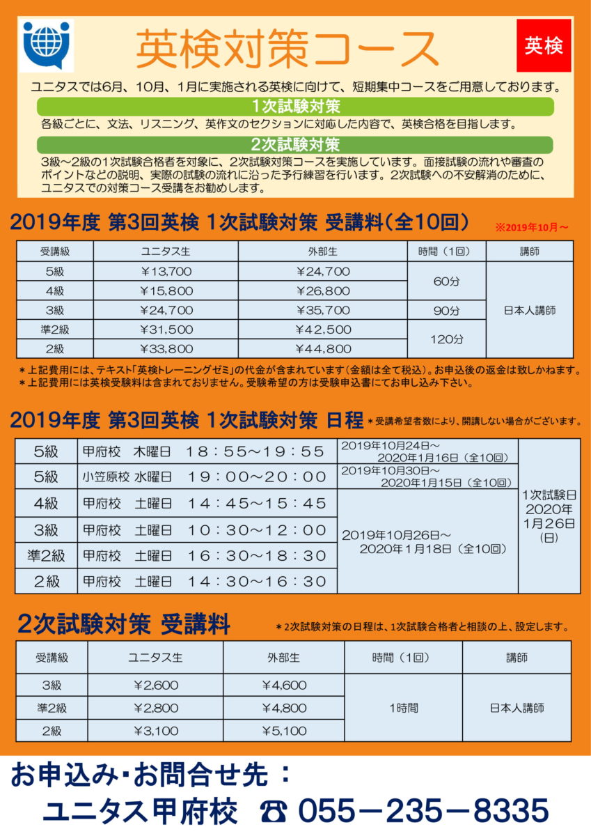 お問合せ・お申込みは、ユニタス甲府校(055-235-8335)まで。