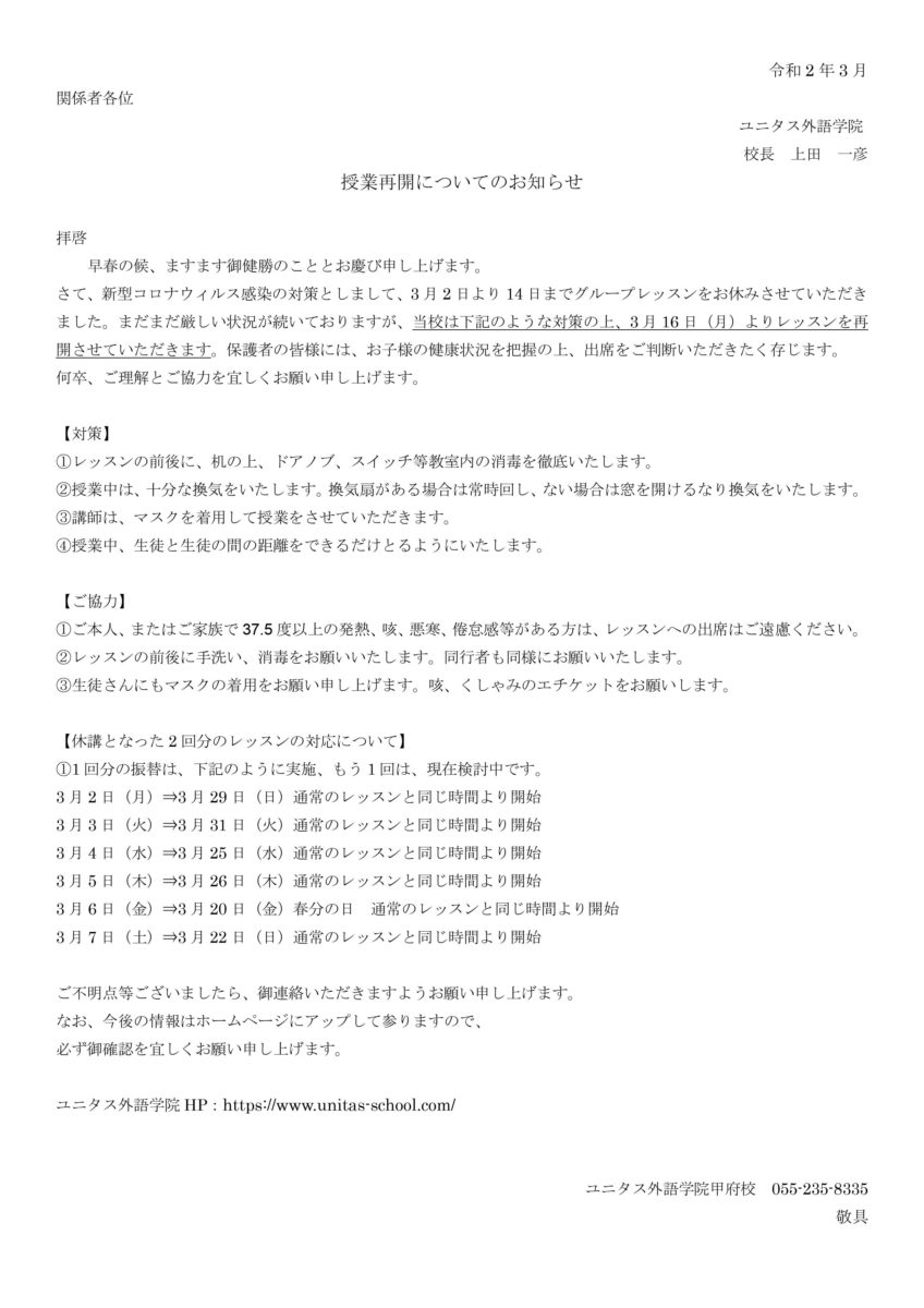 コロナウイルスの感染予防のため2020年3月2日(月)より3月14日(土)の期間、幼児から高校生のグループレッスンを休校とさせていただいておりましたが、甲府地区、富士吉田地区の教室について下記のとおり3月16日(月)より授業を再開させていただきますのでご連絡申し上げます。