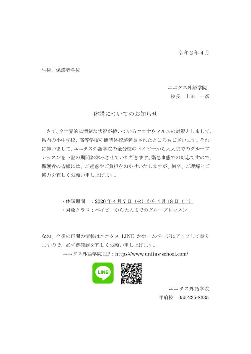 下記のとおり、ユニタス外語学院の山梨地区全分校(甲府本校、敷島校、小笠原校、昭和校、山梨校、富士吉田校、河口湖校、大月校)の ベイビー から大人 までのグループレッスンを 下記の期間 お休みさせていただきます。緊急事態での対応ですので、保護者の皆様には、ご迷惑やご負担をおかけいたしますが、何 卒、ご理解とご協力を宜しくお願い申し上げます。