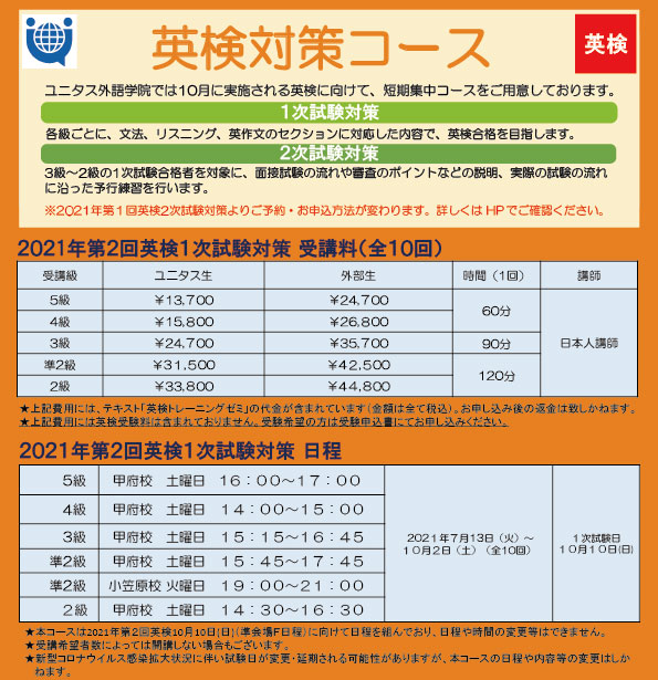 ユニタスでは2021年10月に行われる2021年度第2回英検に向け、 [短期集中]の 英検対策コースを甲府校と小笠原校で開講いたします。 各級、文法・リスニング・英作文の各セクションに対応した1次試験対策コースを受講し、 日本人講師による全回の集中レッスンで、英検合格を目指しましょう! ■ 開 講 日 2021年7月13日(火)よりスタート ■ 開講教室 ユニタス甲府校(甲府市宝1-20-22)/ ユニタス小笠原校 ※準2級のみ(南アルプス市小笠原1690-8) ■ 開 講 級 5級・4級・3級・準2級・2級 ■ 授業回数 全10回 ※開講日時、受講料及びその他詳細は、下記のご案内をご覧ください。 ※本コースは2021年第2回英検10月10日(日)準会場F日程に向けてスケジュールを組んでおり、日程や時間の変更等はできません。 ※1級、準1級は、プライベートレッスンでの対策となります。 ※ユニタスのレッスンに通っていない方も受講していただけます。 お問合せ・お申込みは、ユニタス甲府校まで(055-235-8335)
