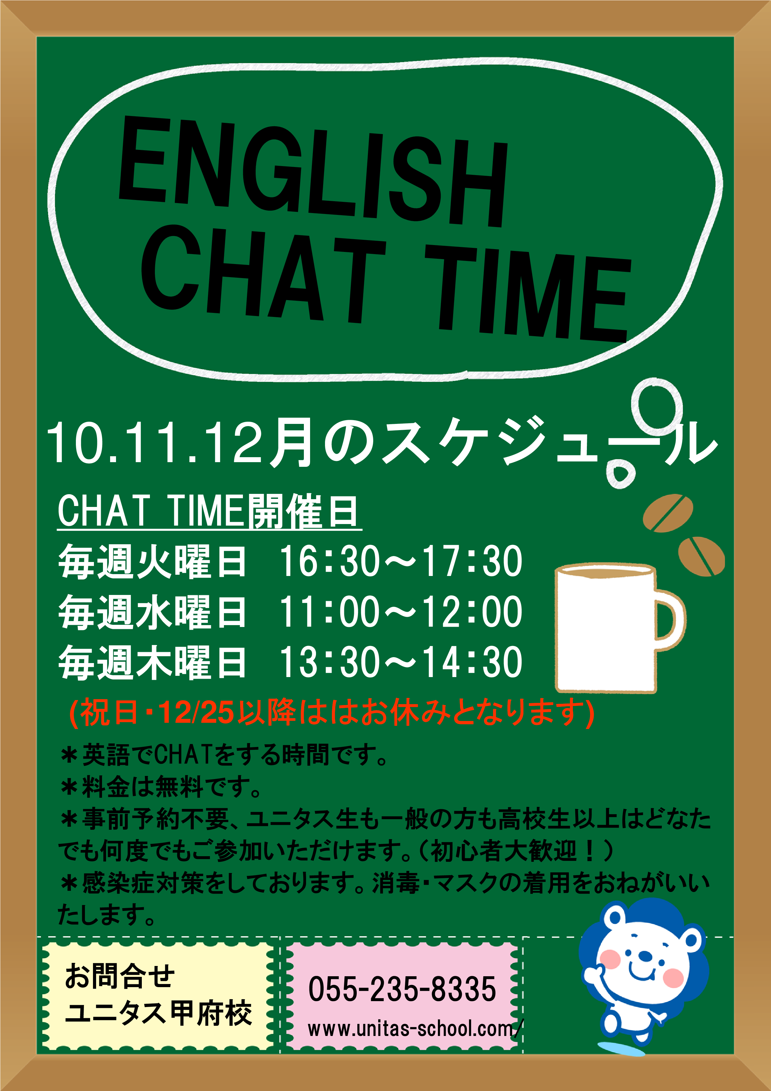 ユニタス2号館にあるインターナショナルラウンジ・UNI CAFEで定期的に開催しているCHAT TIMEの10月~12月のスケジュールをお知らせします。