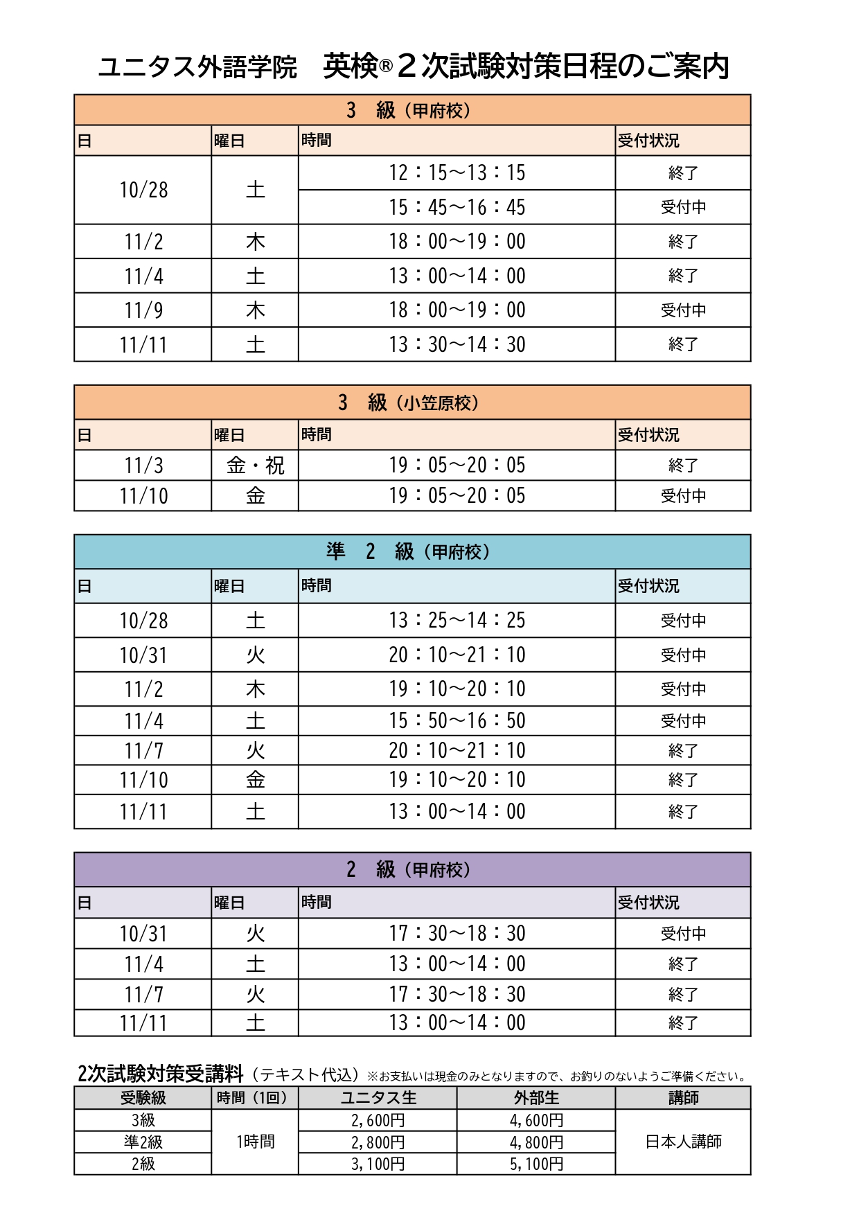 【ご予約開始日程】 10月25日(水)17:00~ 3級 | 10月26日(木)17:00~ 準2級、18:00~ 2級