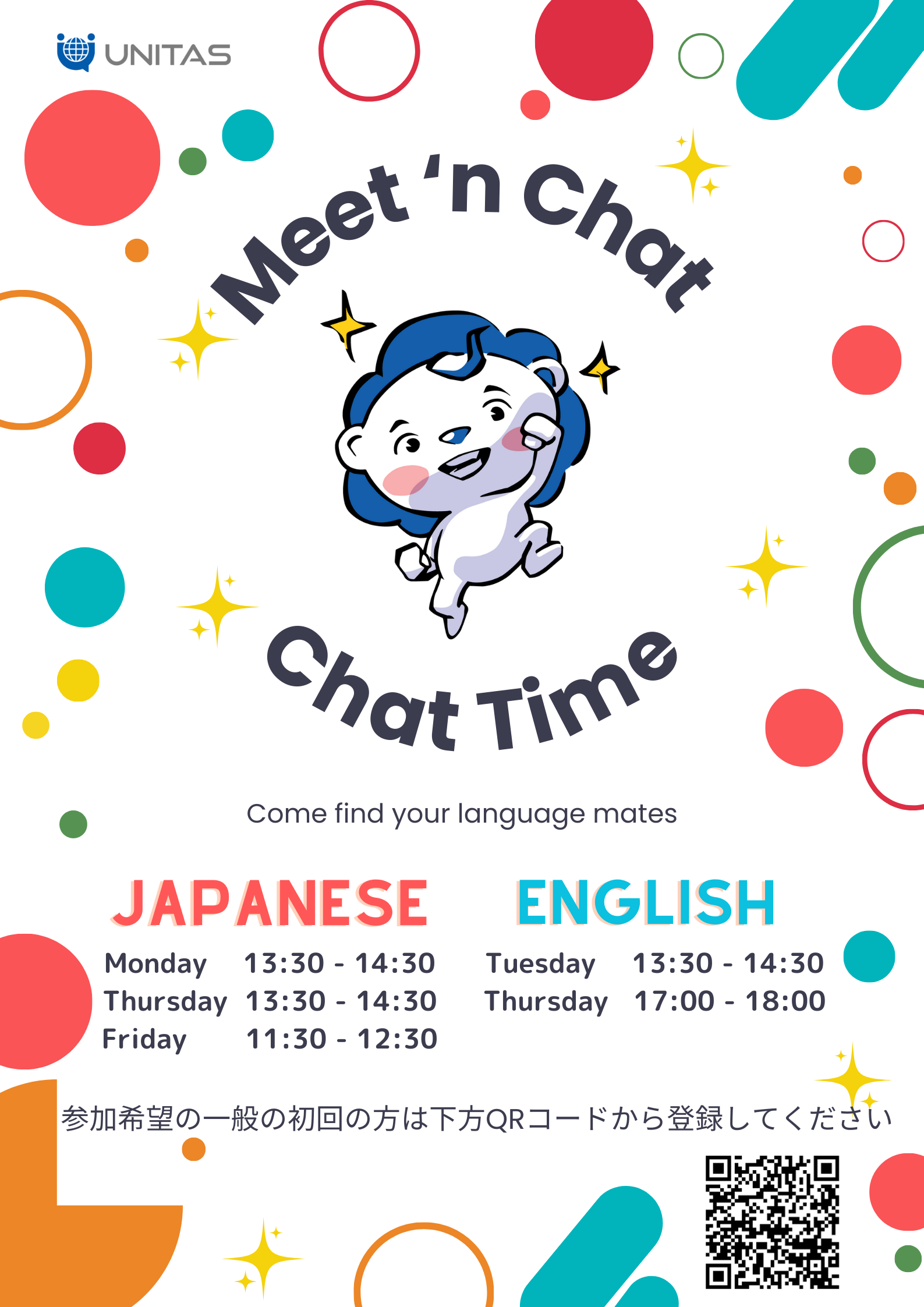 English CHAT TIMEには、毎週、ユニタス日本語学校の留学生が参加します。