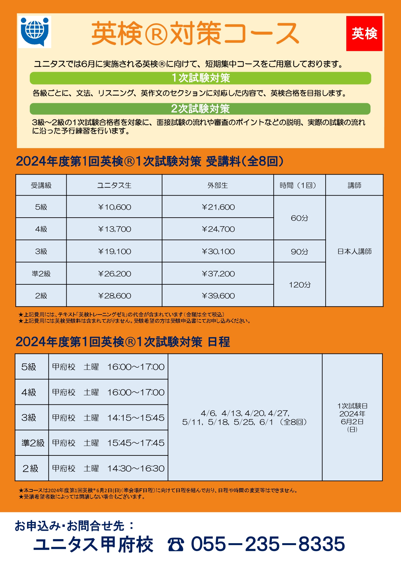 ユニタスでは2024年6月2日(日)に行われる2024年度第1回英検®に向け、 [短期集中]の英検®対策コースを甲府校で開講いたします。 各級、文法・リスニング・英作文の各パートに対応した1次試験対策コースを受講し、 日本人講師による全8回の集中レッスンで、英検合格を目指しましょう! ■ 開 講 日 甲府校:2024年4月6日(土)~2024年6月1日(土) ■ 開講教室 ユニタス甲府校(甲府市宝1-20-22) ■ 開 講 級 5級・4級・3級・準2級・2級 ■ 授業回数 全8回 ※開講日時、受講料及びその他詳細は、下記のご案内をご覧ください。 ※本コースは2024年度第1回英検®2024年6月2日(日)準会場F日程に向けてスケジュールを組んでおり、日程や時間の変更等はできません。 ※1級、準1級はプライベートレッスンでの対策となります。 ※ユニタスのレッスンに通っていない方も受講していただけます。 お問合せ・お申込みは、ユニタス甲府校まで(055-235-8335)
