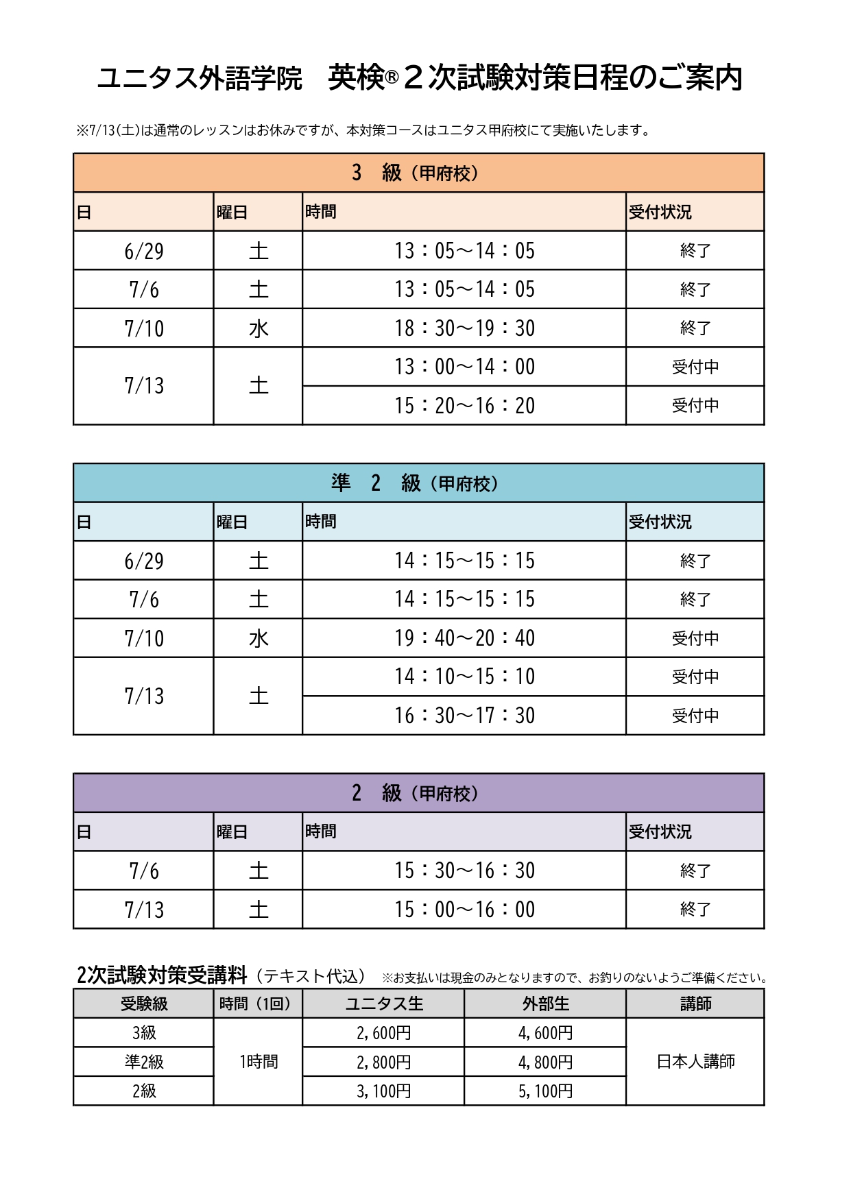 【ご予約開始日程】 6月26日(水) 17:00~ 3級 | 18:00~ 準2級 | 19:00~ 2級