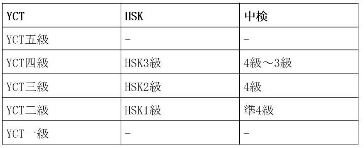 ・YCT(三級)の合格者は、中国語を使用して、周知の日常的話題について簡単かつ直接なコミュニケーションがとれ、初級レベルの上位にランクする。