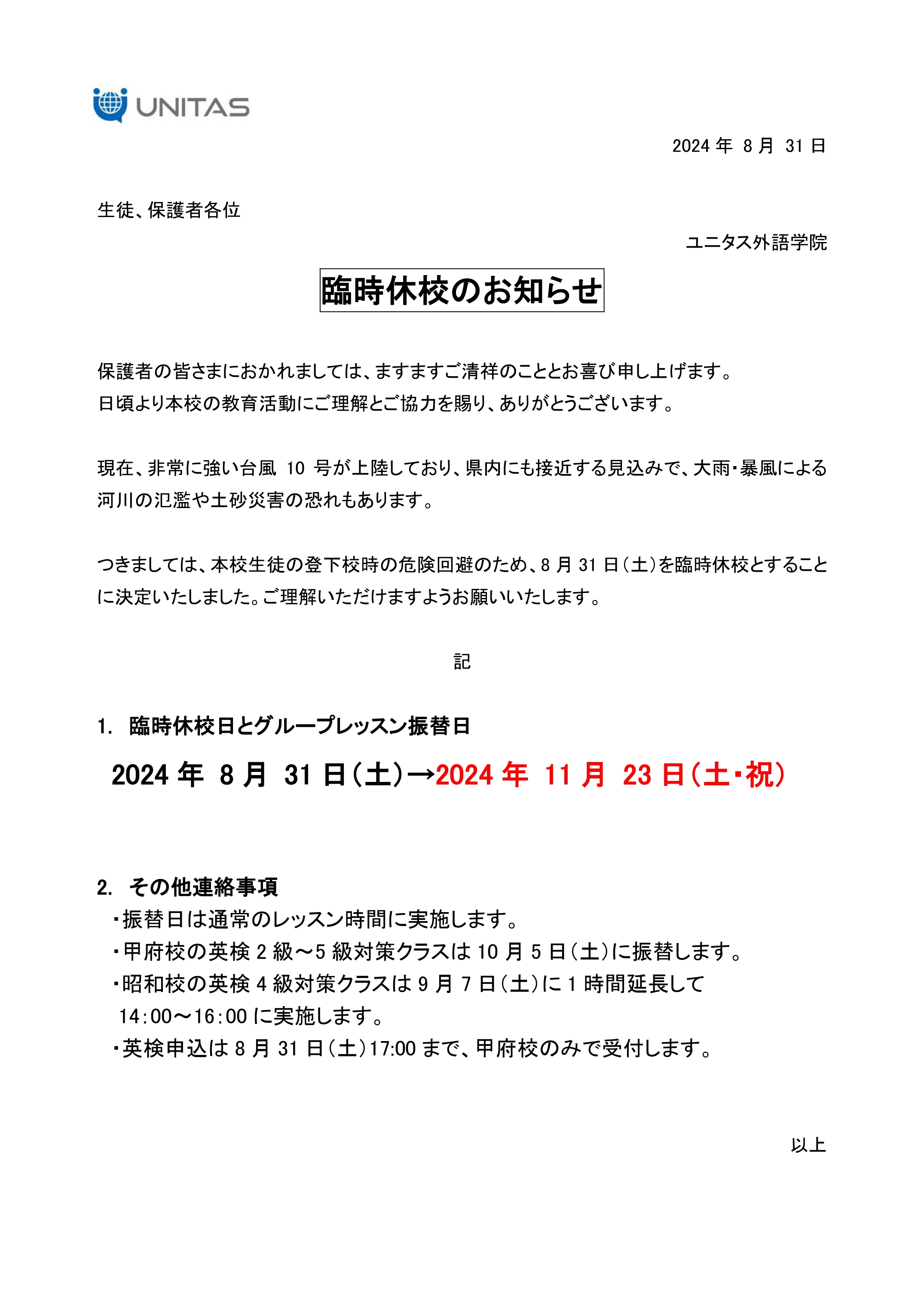 2024年8月31日(土)臨時休校のお知らせ