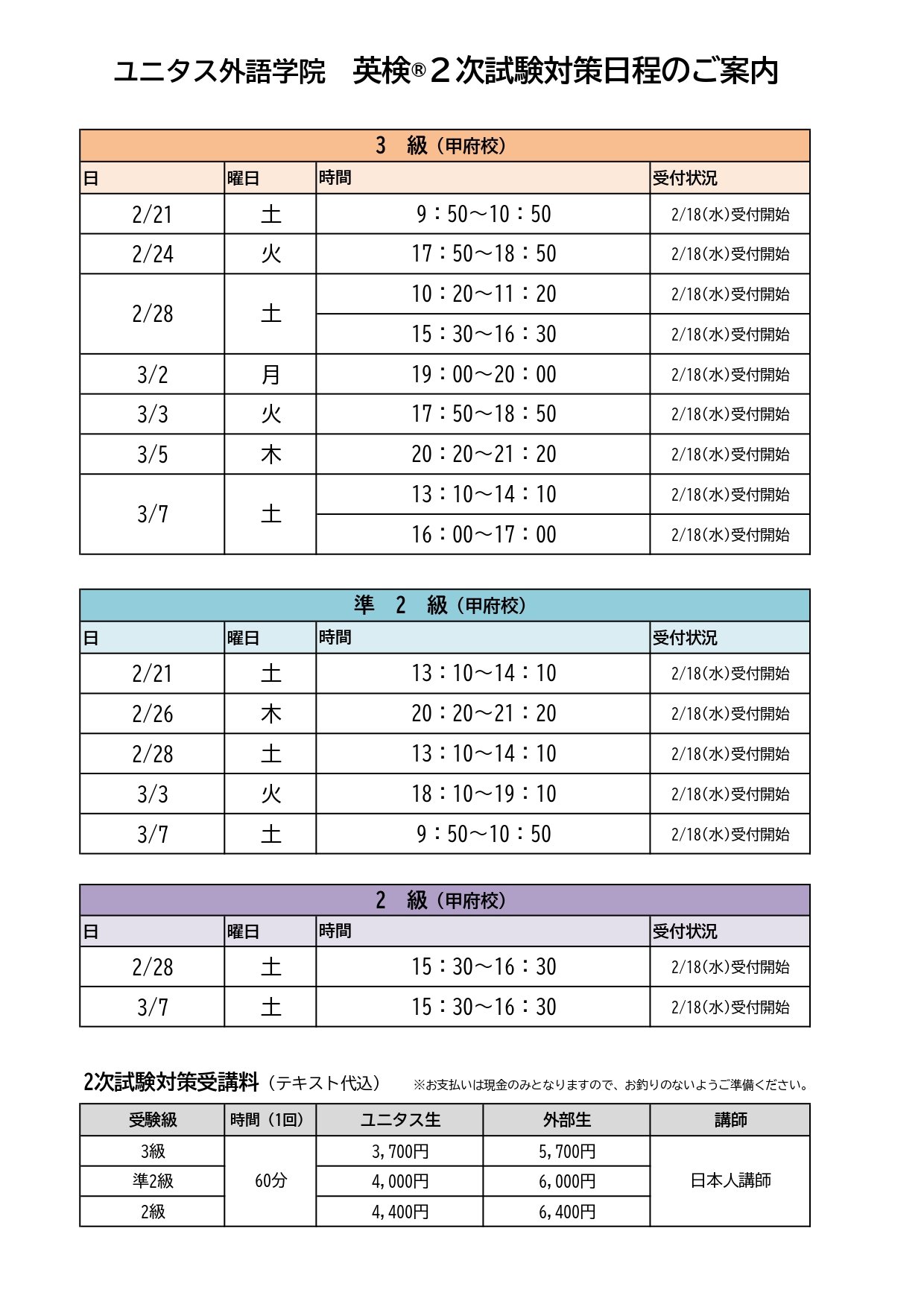 【ご予約開始日程】 2月18日(水) 17:00~ 3級 | 18:00~ 準2級 | 19:00~ 2級