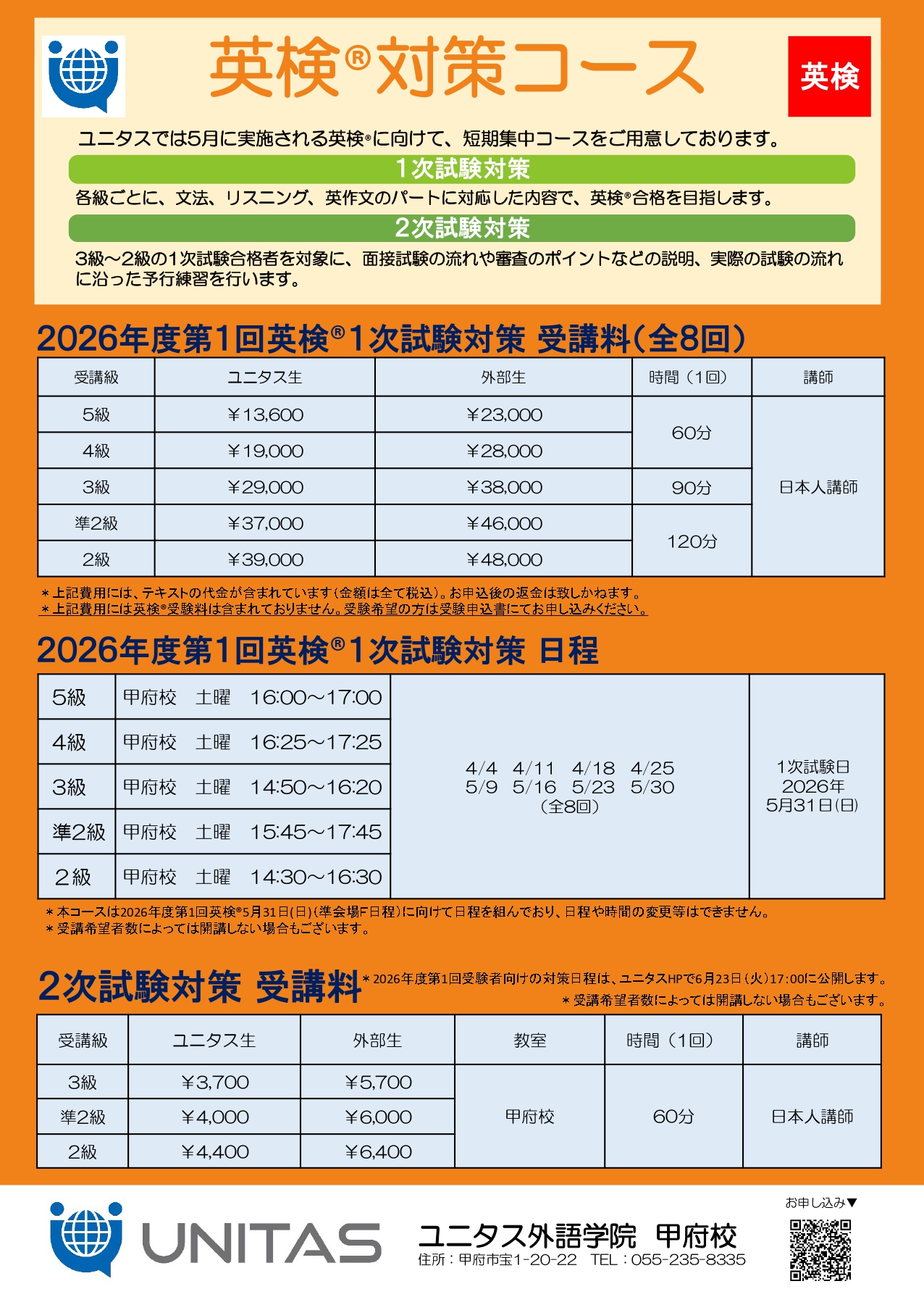 ユニタス外語学院では2026年5月31日(日)に行われる2026年度第1回英検®に向け、 [短期集中]の英検®対策コースを甲府校で開講いたします。 各級、文法・リスニング・英作文の各パートに対応した1次試験対策コースを受講し、 日本人講師による全10回の集中レッスンで、英検合格を目指しましょう! ■ 開 講 日 甲府校:2026年4月4日(土)~2026年5月30日(土) ■ 開講教室 甲府校(甲府市宝1-20-22) ■ 開 講 級 5級・4級・3級・準2級・2級 ■ 授業回数 全8回 ■ お申込み 専用フォームよりお申し込みください。 ※開講日時、受講料及びその他詳細は、下記のご案内をご覧ください。 ※本コースは2026年度第1回英検®2026年5月31日(日)準会場F日程に向けてスケジュールを組んでおり、 日程や時間の変更等はできません。 ※1級、準1級はプライベートレッスンでの対策となります。 ※ユニタスのレッスンに通っていない方も受講していただけます。